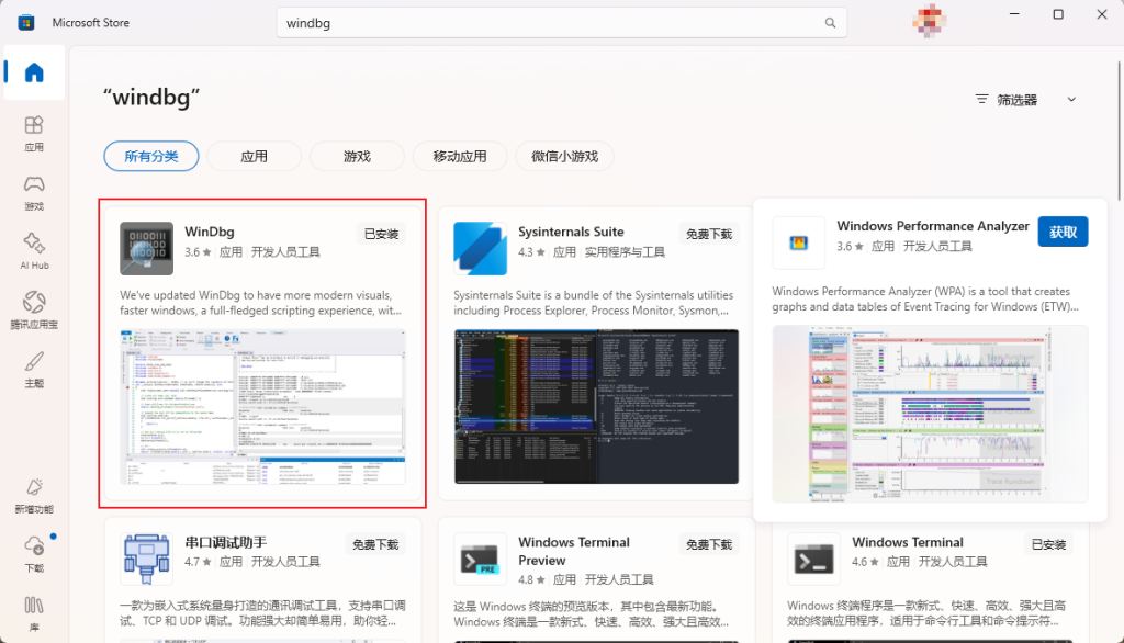 - 安装后在开始菜单找到 WinDbg 打开即可