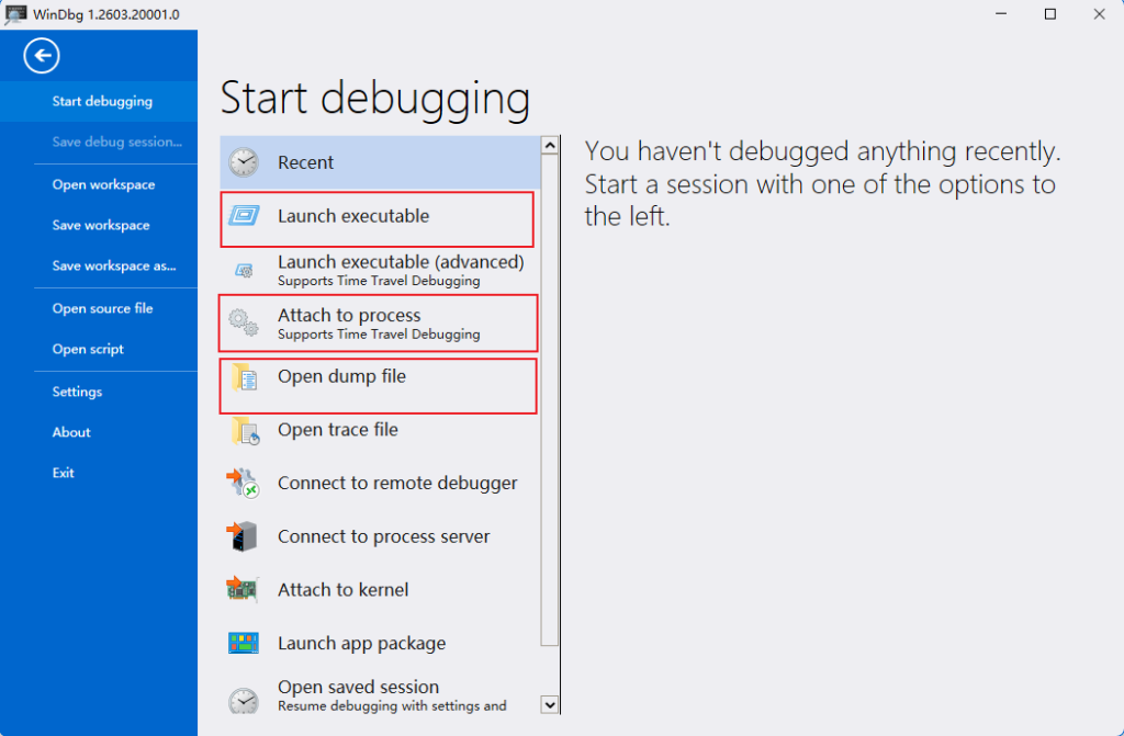 WinDbg 支持 3 种用户模式调试启动方式,按需选择: