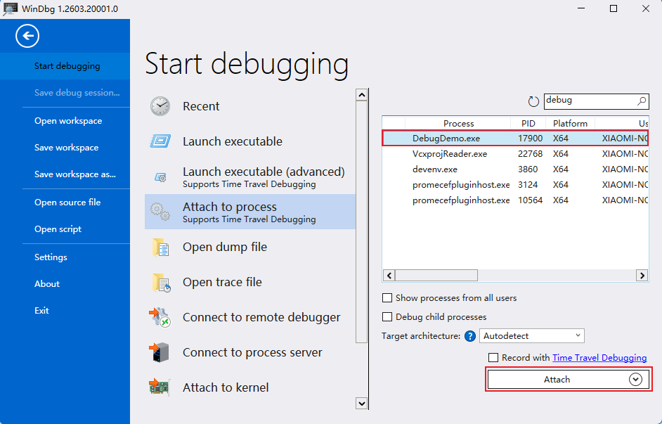- 附加到运行进程:菜单 File → Attach to Process,通过进程名 / PID 选择目标进程。