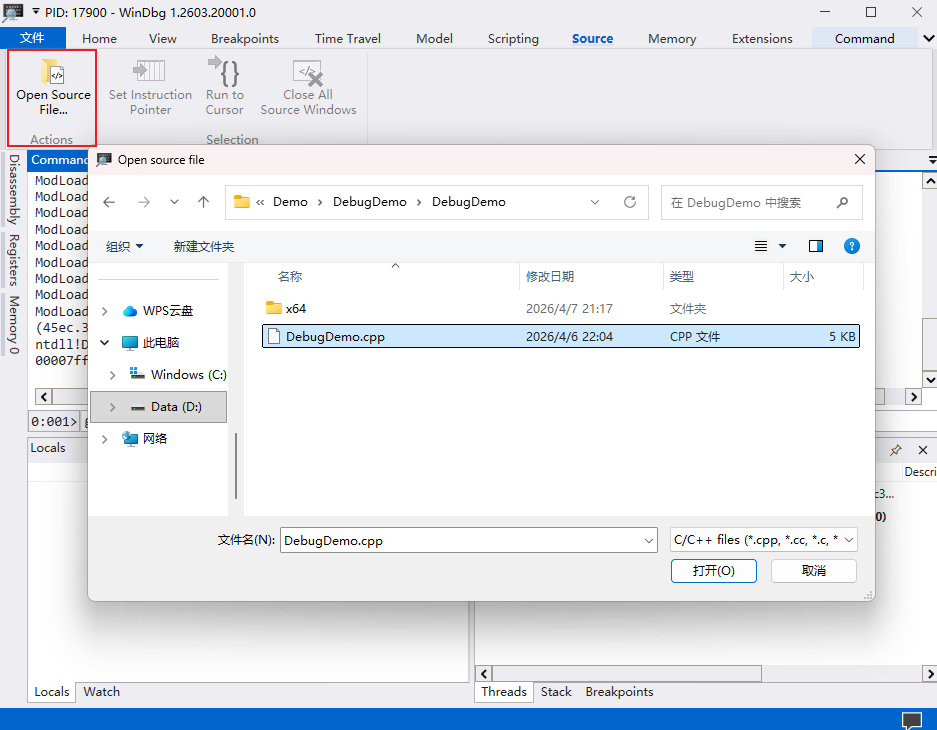 - 调试崩溃转储(DMP):菜单 File → Open Crash Dump,加载 DMP 文件(优先完整转储)。